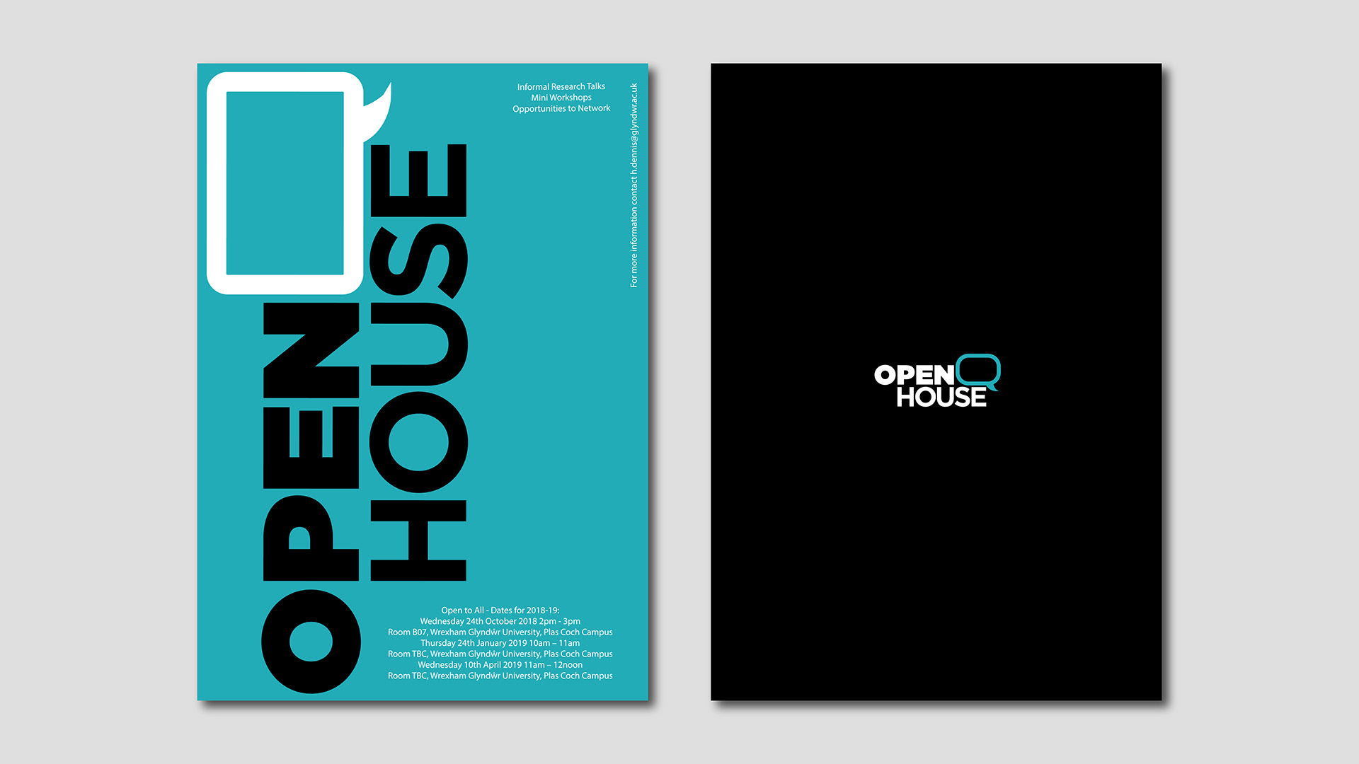 I was contacted by Wrexham Glyndŵr University to redesign their logo for Open House, which is a discussion group held every week on the university grounds. The discussions could be about any topic and information was displayed on posters and flyers. To honour this, I took a clean and simple approach to the logo design as to not take up much attention on posters, and to let the body text included provide information. I produced a sophisticated logo with relaxing colours that would be easy on the eye.